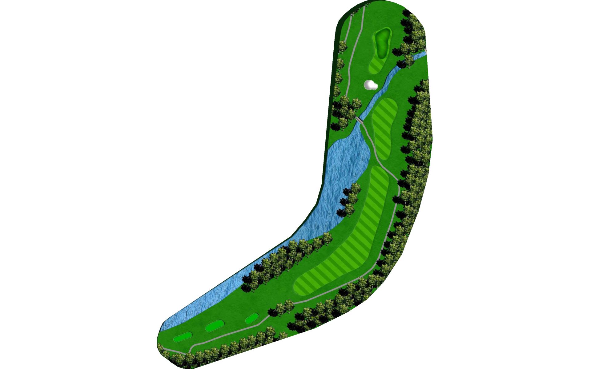 A Par 5, narrow looking tee shot with a penalty area left, past the tee shot the hole turns and opens. Grass mounds surrounding the green make for challenging pitch shots.